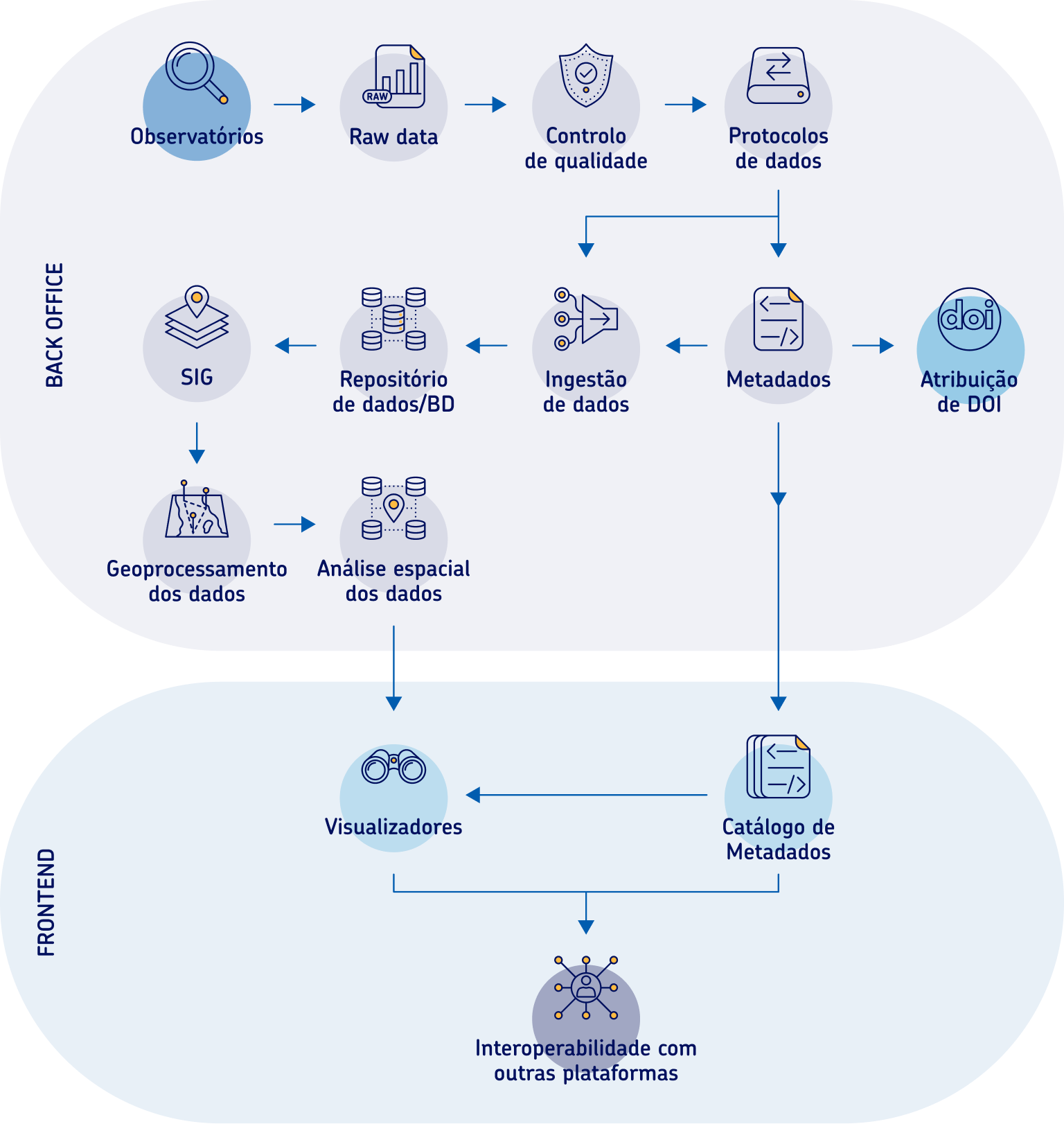 O fluxo dos processos da SOMOSATLÂNTICO resume-se no diagrama seguinte. A interface com os utilizadores faz-se através do catálogo de metadados e dos visualizadores, onde a informação é disponibilizada, agregada por temas, incluindo observatórios in situ , dados de cruzeiros ou modelos de previsão e reanálse.
