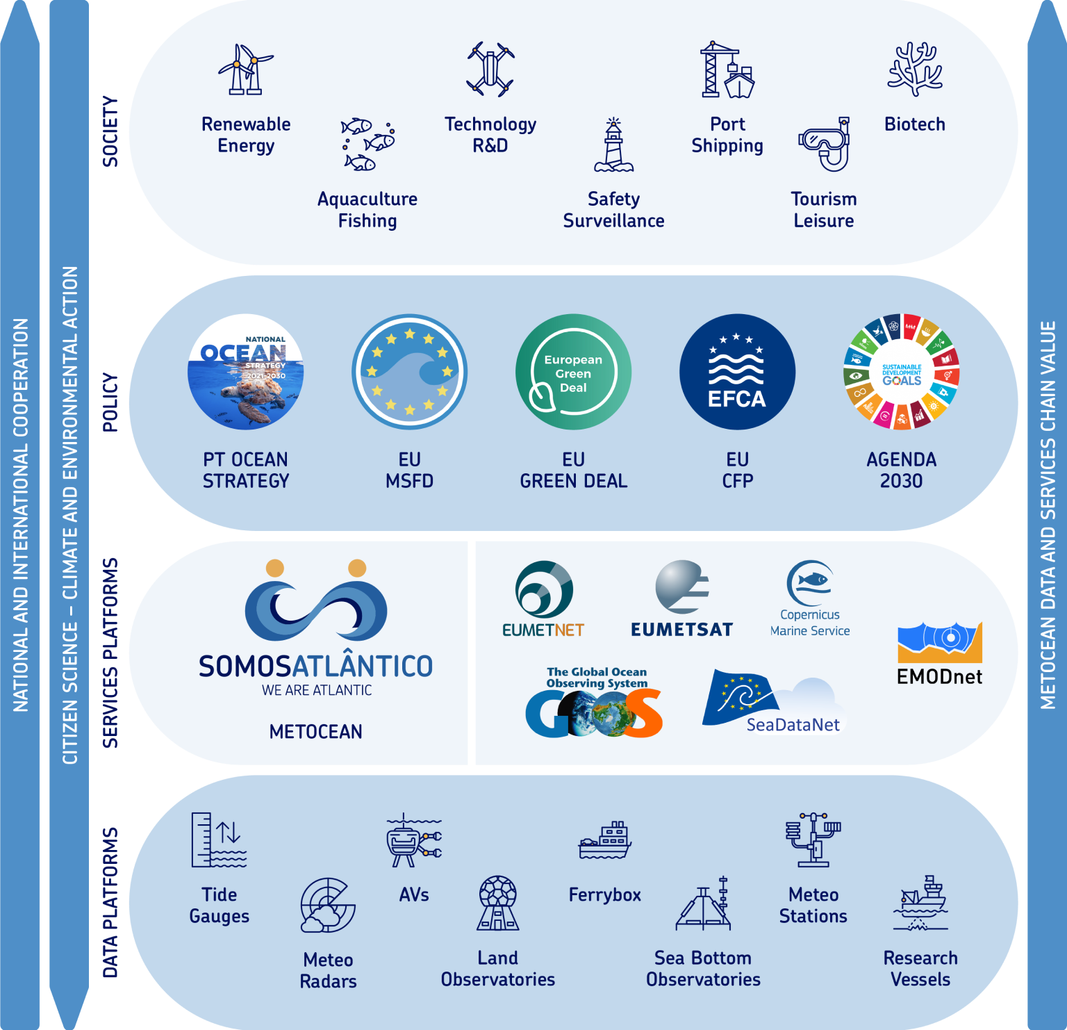 No atual panorama de crescente cooperação nacional e internacional, os dados obtidos a partir de várias fontes e fornecedores, segundo diretrizes e boas práticas globais, têm o potencial para alimentar múltiplos utilizadores, o que significa que cada cruzeiro, equipamento, sensor e medição, contribui para a cadeia de valor global da observação do Oceano. A plataforma SOMOSATLÂNTICO procura contribuir para este esforço, fornecendo acesso a dados marinhos de alta qualidade que abrangem a bacia do Atlântico.